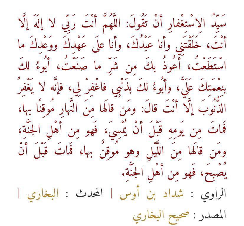 اللهم اغفر لي خطيئتي وجهلي، وإسرافي في أمري وما أنت أعلم به مني، اللهم اغفر لي جدي وهزلي وخطأي وعمدي وكل ذلك عندي، اللهم اغفر لي ما قدَّمت وما أخَّرت، وما أسررت وما أعلنت وما أنت أعلم به مني، أنت المقدم وأنت المؤخِّ وأنت على كل شيء قدير.