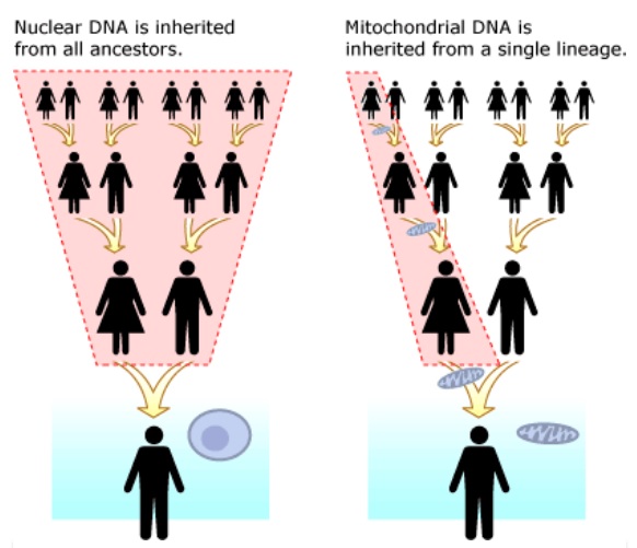 لان الميتوكوندرية الموجودة في الحيوان المنوي الذي يأتي الى الاب يفقدها الحيوان المنوي لحظة دخوله الى البويضة, اذا الخلية المخصبة لن تحوي الا الميتوكوندرية الام!