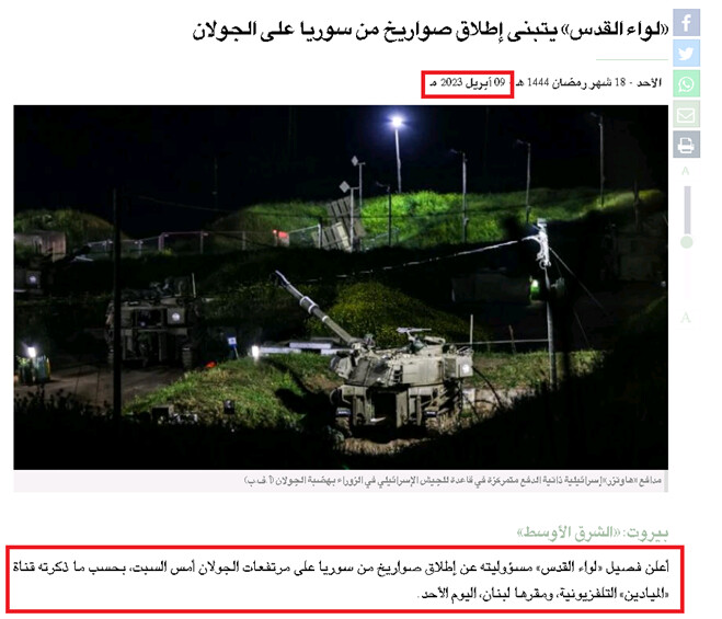 📌 نشرت قناة الميادين في الثامن من إبريل الجاري، خبرًا حول "إعلان فصيل لواء #القدس في #سوريا، مسؤوليته عن ضرب مستوطنات إسرائيلية في #هضبة_الجولان"، ونقلته وسائل إعلام أخرى مثل صحيفة الشرق الأوسط.