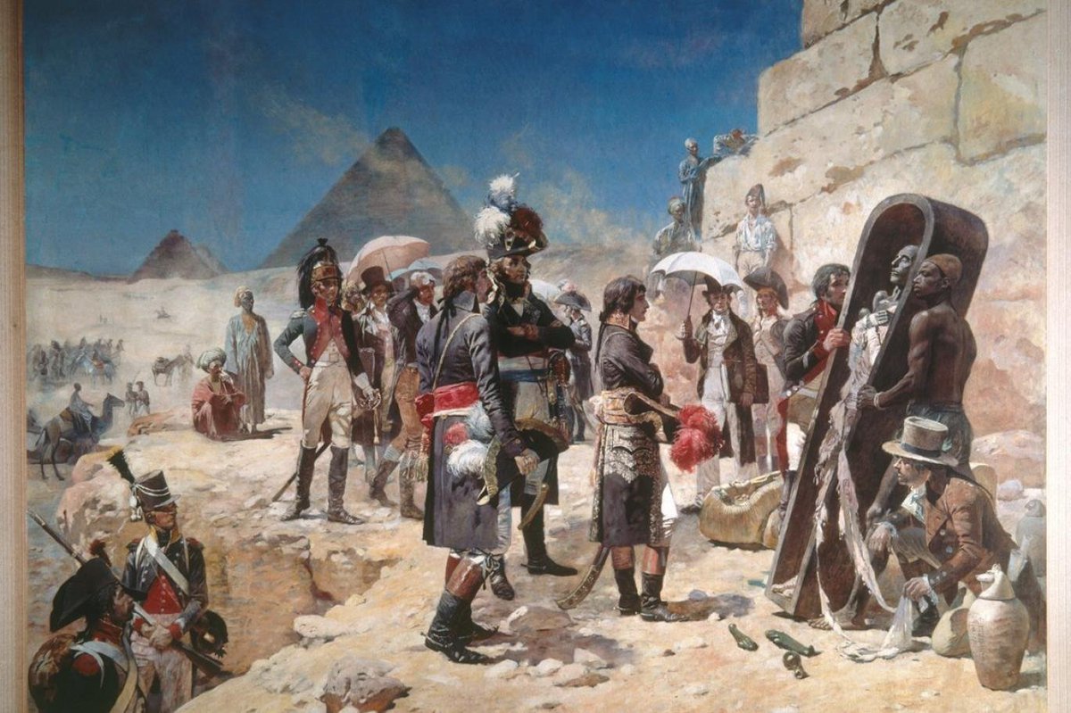 مديراً ظهره للبابا الجالس على الكرسي الرسولي، ليؤكد أنه لا يستمد سلطته منها مرسخاً بذلك فكرة فصل الدين عن الدولة و عدم امتداد سلطة البابا إلى الحكم الفرنسي.