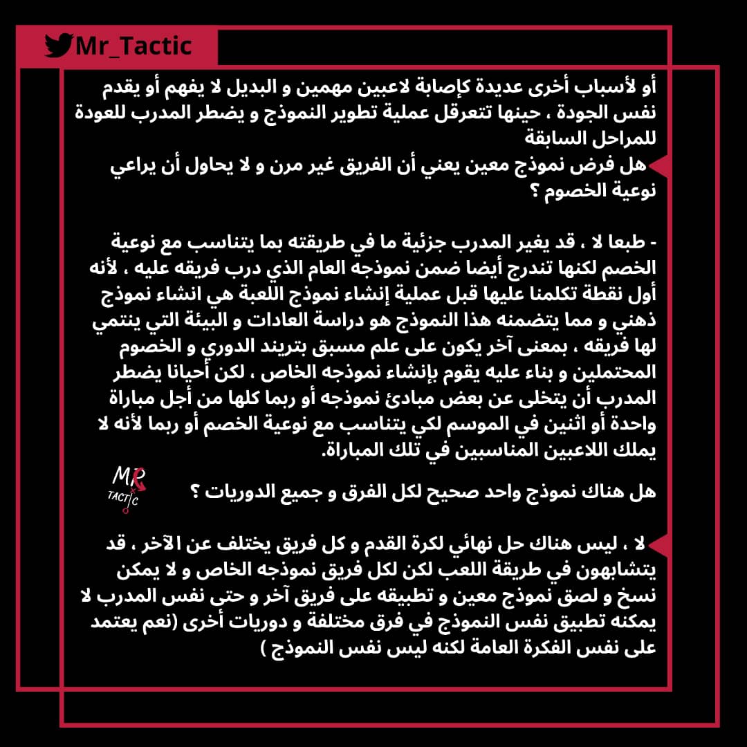 - كل هذه الأسئلة و أكثر تدفع المدرب على إيجاد حلول لها ، على المدرب أن يجيب على كل هذه الأسئلة في كل مراحل اللعب و في كل لحظات المباراة ، و هذا هو نموذج اللعبة ✅
