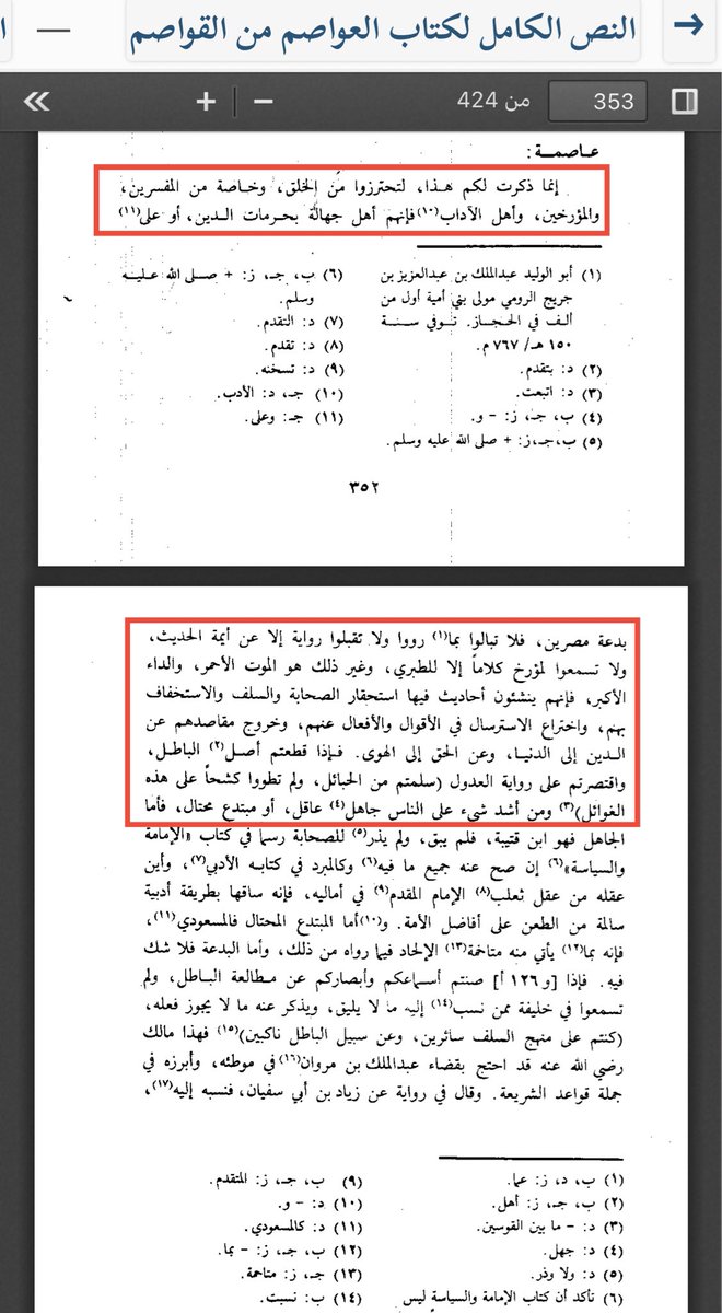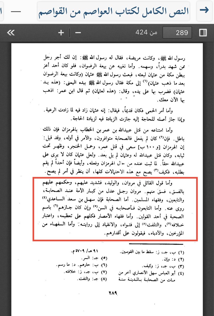 يُعد هذا الكتاب من احد اكثر الكتب التي ينصح بها «أهل السنة» بمختلف مشاربهم (أشعرية وسلفية) اتباعهم في موضوع فتنة مقتل عثمان، والجمل وصفين وكربلاء.