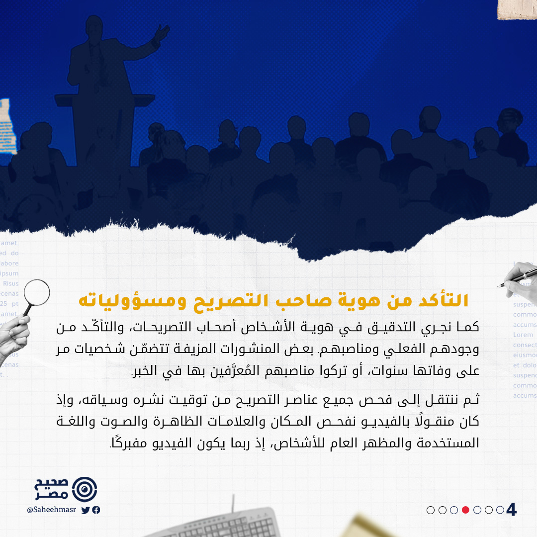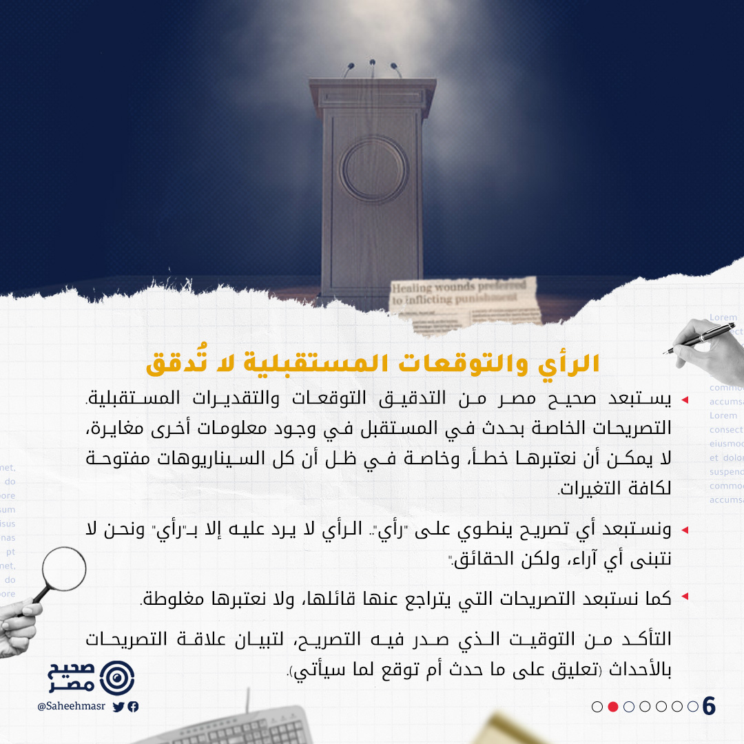 📌 ننشر في صحيح مصر، التصريحات المفبركة، ولكنها لا نعتبرها ضمن "الكذب السياسي"، ولكن ننشرها ضمن فئة "الأخبار المفبركة" التي تنتشر عادة على مواقع التواصل الاجتماعي وبعض المواقع الإخبارية.