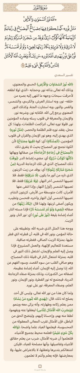 الله نور السموات والأرض يدبر الأمر فيهما ويهدي أهلهما، فهو -سبحانه- نور، وحجابه نور، به استنارت السموات والأرض وما فيهما، وكتاب الله وهدايته نور منه سبحانه، فلولا نوره تعالى لتراكمت الظلمات بعضها فوق بعض. مثل نوره الذي يهدي إليه، وهو الإيمان والقرآن في قلب المؤمن كمشكاة،