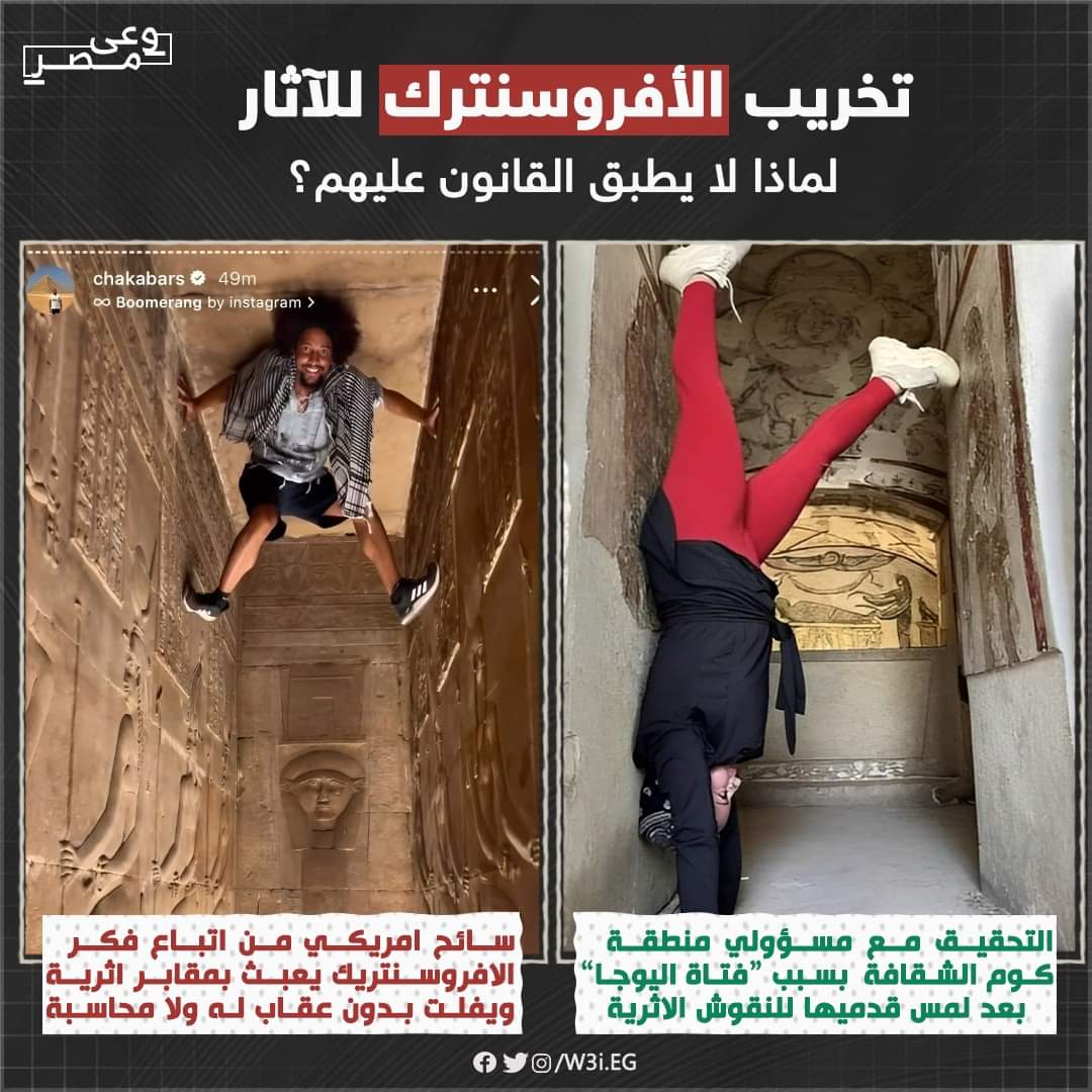وهو اللي قام بيه السائح والبلوجر الامريكي من أصل أفريقي "chakabars" واللي بيمتلك فوق المليون متابع على الانستجرام، خلال زيارته السياحية لمصر لما زار عدد من الاثار المصرية منها منطقة الاهرامات بالجيزة وعدد من المعابد والمناطق الاثرية