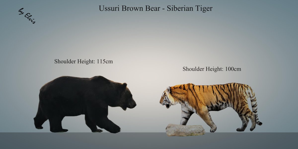 ويعتقد كما أسلفنا أن الدببة الضخمة تتحاشى الاقتتال مع النمور الكبيرة الحجم، لأنها وبالرغم أنها تفوقها في الحجم، إلا أن قوة النمر المعهودة قادرة على قتل الدببة، وحتى ولو كانت معمرة وضخمة .