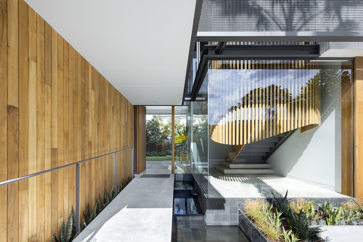 لاحظ أن درابزين الدرج "وهو في مقدمة المنزل" تحول إلى مكون جمالي وهو من الخشب