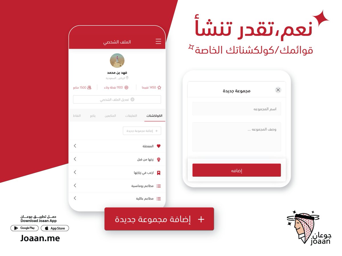 هل يمكنني إنشاء قائمة #مطاعم تخصني؟ نعم يمكنك إنشاء قائمة مطاعم أو مقاهي زي ما تحب وبعدد لا محــــــدووود لمطاعم تحبها في مدينة محددة (لندن، الرياض، دبي ..إلخ) أو مطاعم تلاقي عندها شيء تحبه (برجر، شاورما ... ) تقدر تنشأ قوائمك مثل ما تحب، والي نسميها في #تطبيق_جوعان (كولكشنـات)