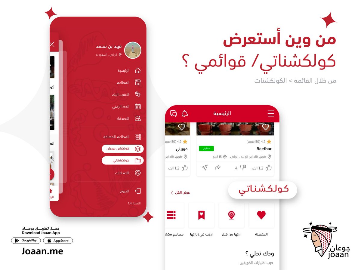 من وين استعرض كولكشناتي/ قوائمي؟ القائمة> الكولكشنات. ولا في أي مكان تلاقي فيه صورتك 🖼️اضغط على صورتك وراح تدخلك على بروفايلك، وتلاقي كولكشناتك. إذا دخلت على أي كولكشن، راح تترتب الم #مطاعم حسب الأقرب إليك، وراح نطور فلاتر إنك تقدر تستعرضها بأفكار ثانية بس اصبر علينا شوي📷😉