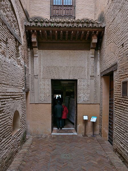’’تخاطبه واجهة مدخل بهو أو قاعة قمارش [مجلس العرش] عبر أبيات مسطورة لابن زمرك: ‘‘