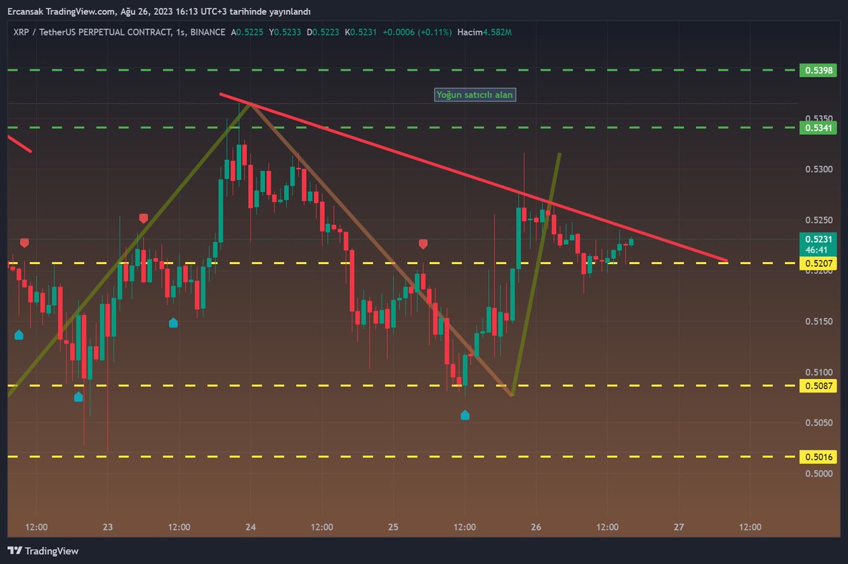 XRP'nin şimdilik durumu iyi görünüyor. En yakın desteği 05207$ Bu fiyat altında saatlik kapanış gelirse daha fazla düşüş gelebilir. Bu destek fiyatı üzerinde kaldığı sürece devam. Aksi durumlarda STOP!
