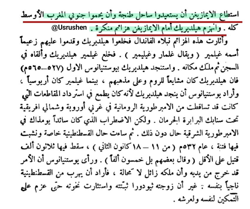 ▪︎و بسبب هزائم الأمازيغ خاصو في المغرب (طنجة و سواحلها ) يقول عنها المؤرخ :"" إستطاع الإيمازيغن أن يستعيدوا ساحل #طنجة و أن يحموا جنوب #المغرب_الاوسط و انهزم #هيلدريك أمام #الإيمازيغن هزائم منكرة"" ، اين الذين يقولون قاموا بتحريرنا حررتمونا من ماذا ؟