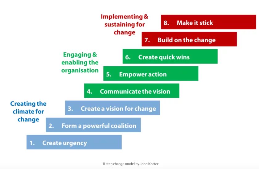1. إنشاء الشعور بالضرورة: هذه الخطوة تتطلب من القادة أن ينشئوا الشعور بالضرورة والحاجة للتغيير.