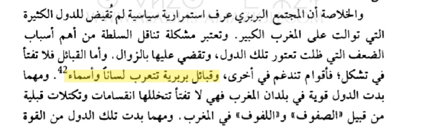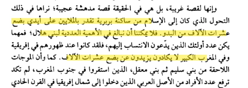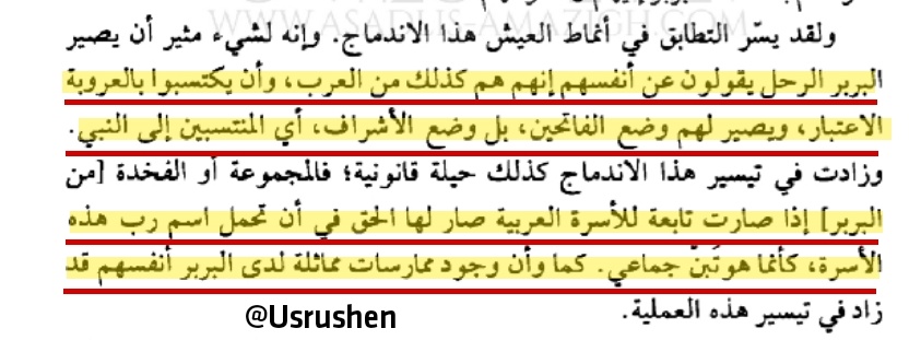 ▪︎""إنه لشيء مثير ان يصير البربر الرحل يقولون عن انفسهم انهم هم كذلك من #العرب ، و ان يكتسبوا #بالعروبة الاعتبار و يصير لهم وضع الفاتحين، بل #وضع_الأشراف اي المنتسبين الى #النبي، و زادت في تيسير هذا الإندماج كذلك حيلة قانونية"" !