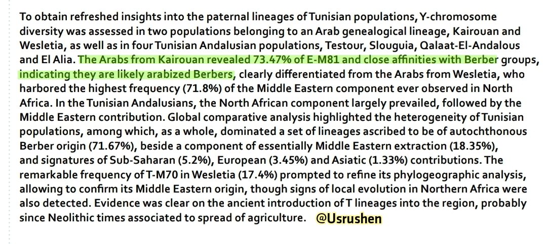 ▪︎و هذه دراسة جينية من المجلة الشهيرة للعلوم Nature ، بعنوان Insights into the Middle Eastern paternal genetic pool in Tunisia: high prevalence of T-M70 haplogroup in an Arab population، و هي الفاس الذي سيقسم رؤوس المستعربة و يعيدهم لصوابهم ربما و ما تؤكده هذه الدراسة رهيب!