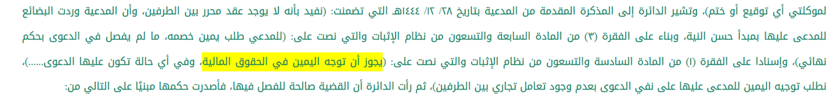 لا توجه اليمين الحاسمة في دعوى مخالفة للنظام العام . وعلى المحكمة منع توجيه اليمين اذا كانت غير متعلقة في الدعوى ولا منتجة فيها .