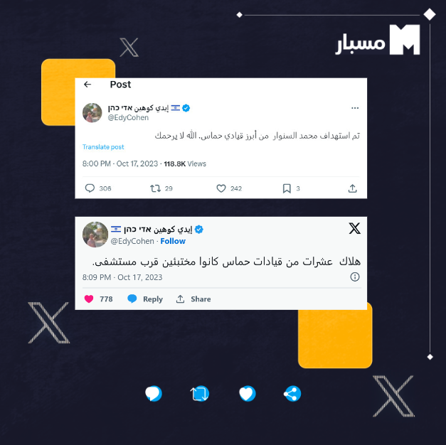 أفيخاي أدرعي، إيدي كوهين، حنانا نفتالي وغيرهم.. #مسبار يتتبع مجموعة من الحسابات الإسرائيلية ويرصد كيفية تغيّر روايتها حول #المستشفى_المعمداني