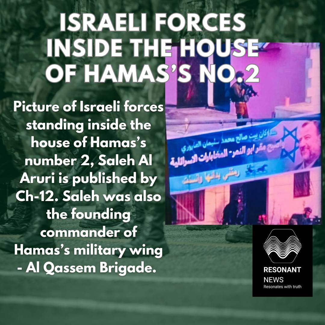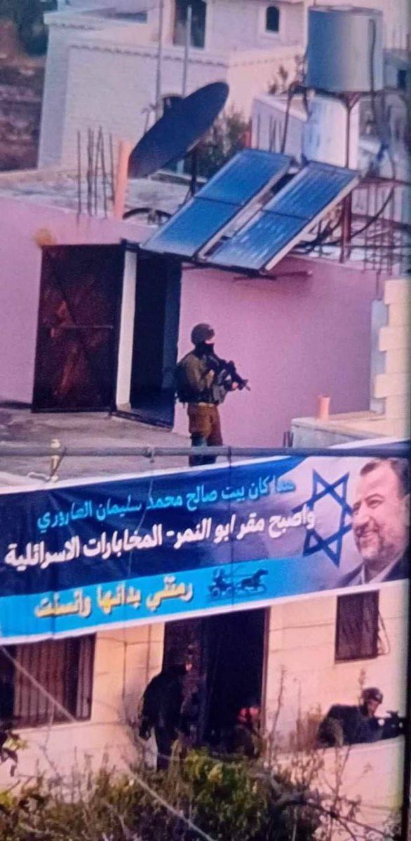 Outside the house, troops put up a banner of the Hamas deputy against the background of an Israeli flag that read: “This was the house of #SaleAlAruri and has become the headquarters of #AbuAlNimer — Israeli intelligence,” witnesses say.