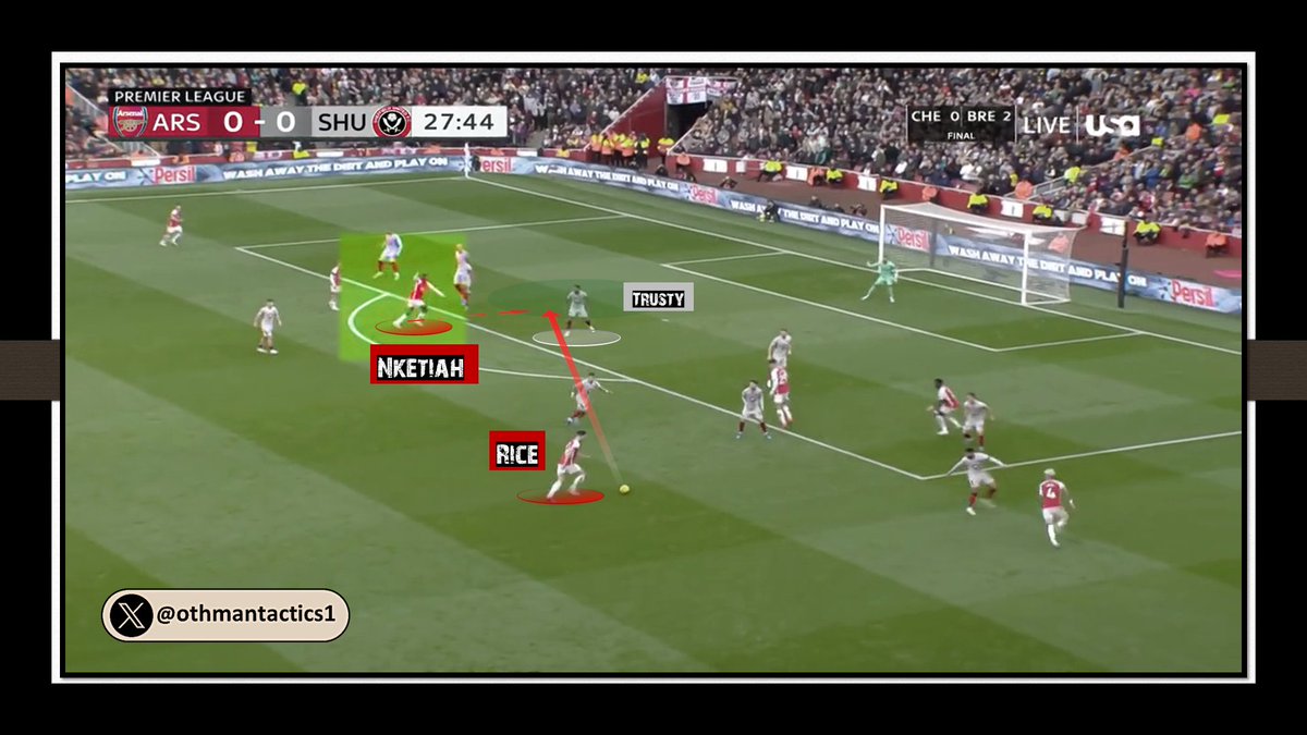 تمرر الكرة لرايس اللي بيشير اليه نيكتياه في المساحه خلف المدافع Trusty اللي بيقوم نيكتياه بسرقه المساحه منه والوقت والتسجيل بسلاسه علي طريقه نجوم بداية الالفيه