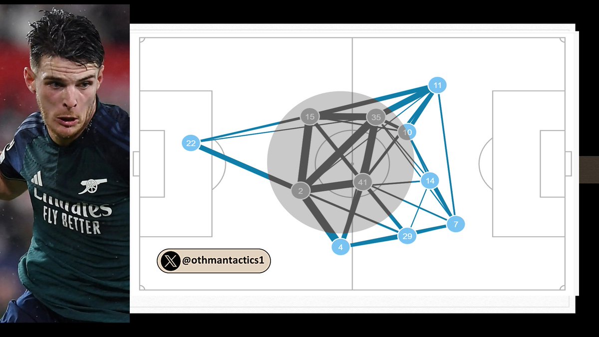 - الهدف الاول جمله من محاوله تحرك من هافرز ليفتح مسار تمرير الي بن وايت اللي بيمررله عوضا عن الضغط اللي كان محاصر رايس