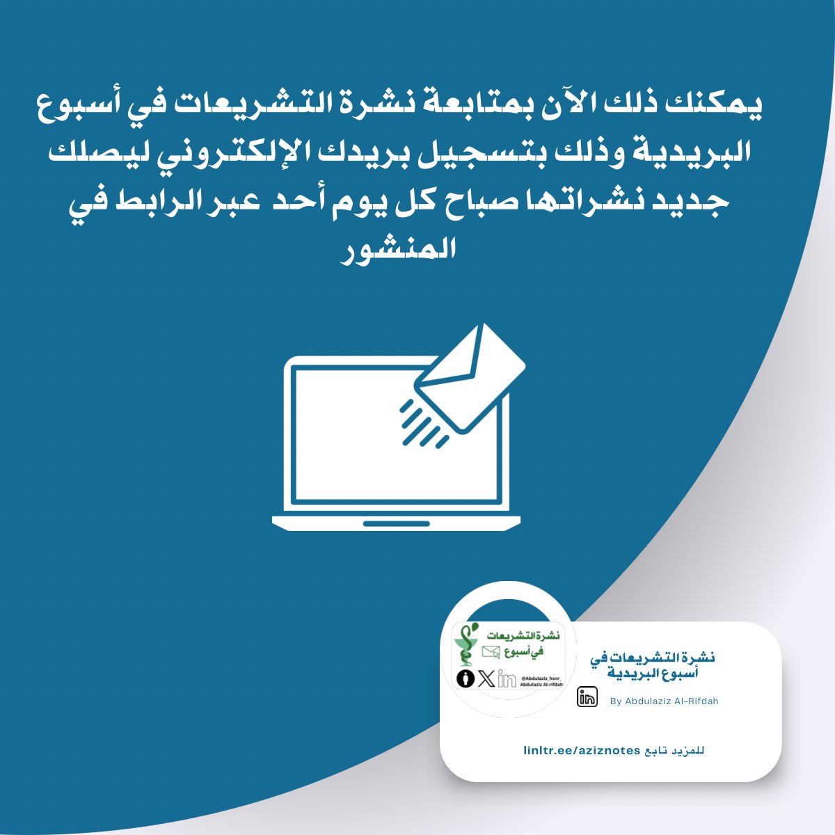 يمكنك ذلك الآن بمتابعة نشرة التشريعات في أسبوع وذلك بتسجيل بريدك الإلكتروني ليصلك صباح كل يوم أحد عبر الرابط 📫.