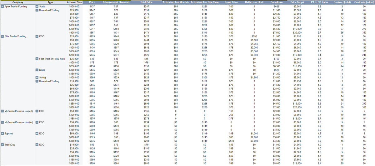 Made an excel document to sort through Futures Prop Firms and compare them (costs, drawdown type, etc). Will add more firms when I get time.