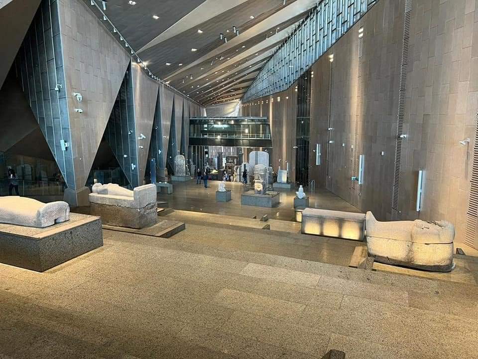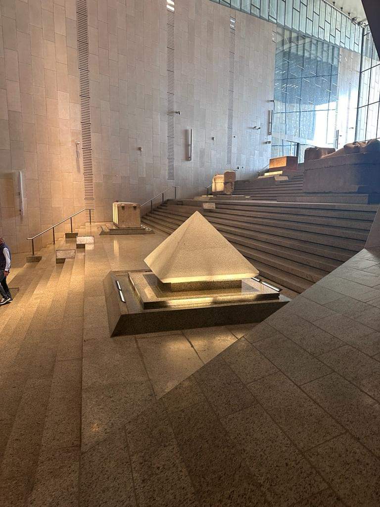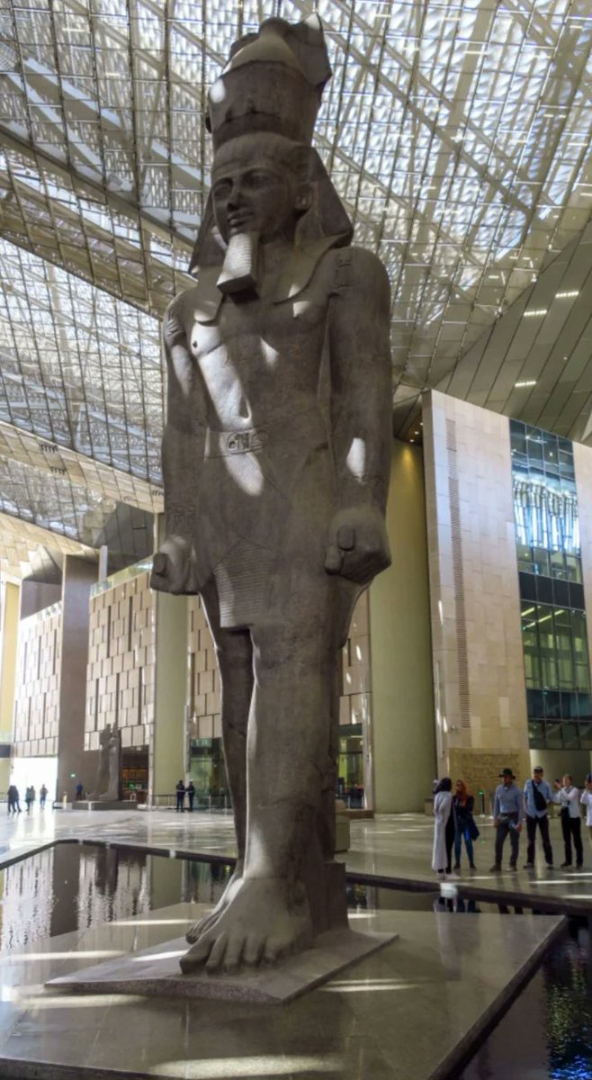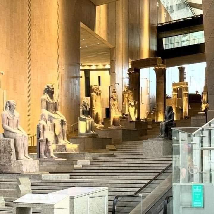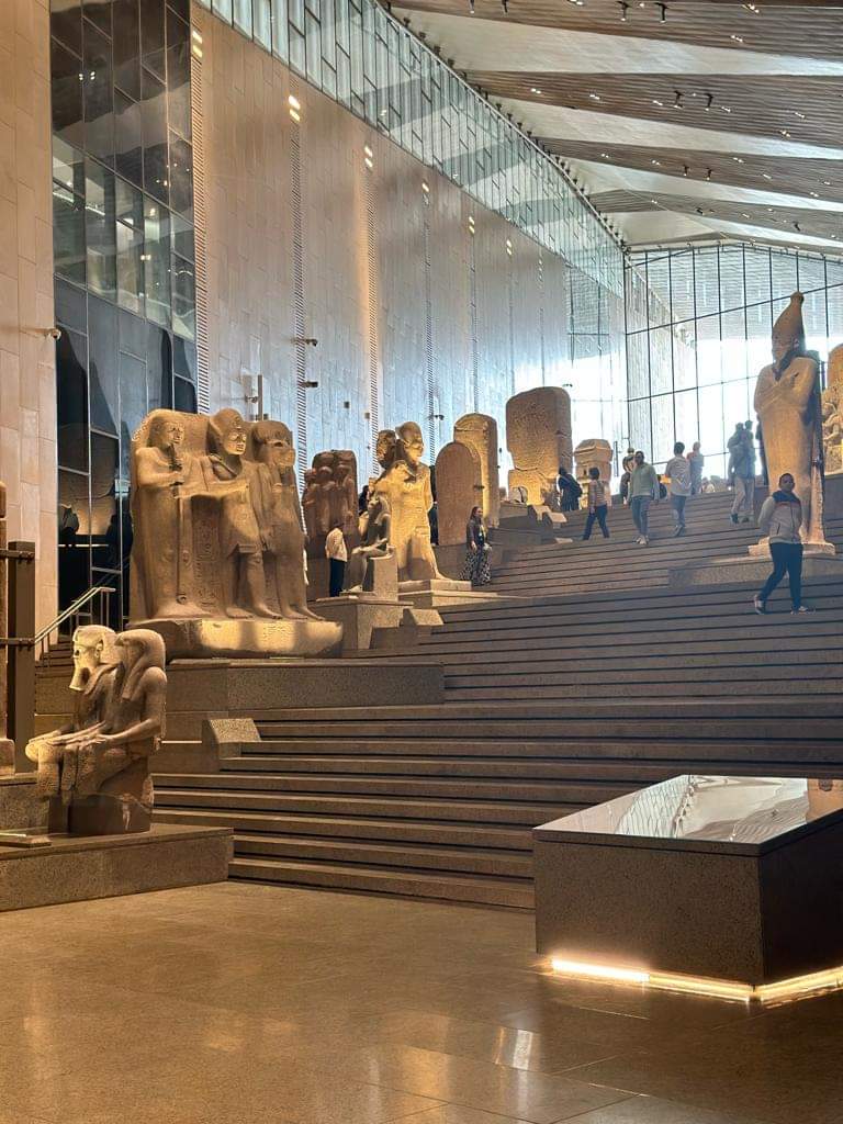 6-الدرج يصعد من البهو الذي فيه تمثال الملك رمسيس الثاني صاعدًا إلى قاعات العرض عبر 105سُلمة ومتدرجًا عبر 4 مستويات وعليه مجموعة من أفضل وأضخم القطع الأثرية الثقيلة التي تجسد روائع فن النحت في مصر القديمة والتي تبدأ من عصر الدولة القديمة وحتى العصر اليوناني الروماني 👇