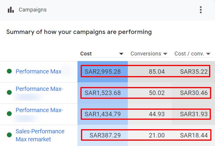 أطلقنا الحملات الثلاثة بميزانية مبدئية لكل حملة 100 ريال يومياً ووضعنا هدف للعائد على الانفاق (ROAS) 400% وهو ما يعني أننا نريد من جوجل تحسين الاعلانات بحيث نحصل على 4 ريال مبيعات لكل ريال يتم انفاقه في الاعلانات.