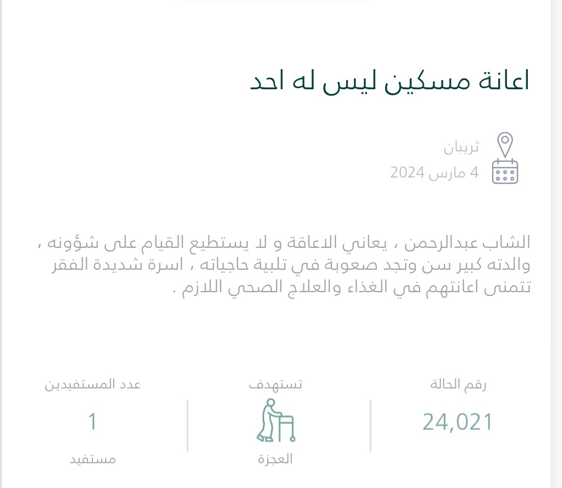 قبل نكمل هنا هنا حالة أسرة ، تكالبت عليهم الظروف المعيشيّة والظروف الصحية، ام كبيرة سن وولدها يعاني من إعاقة ولايوجد مصدر دخل لهم