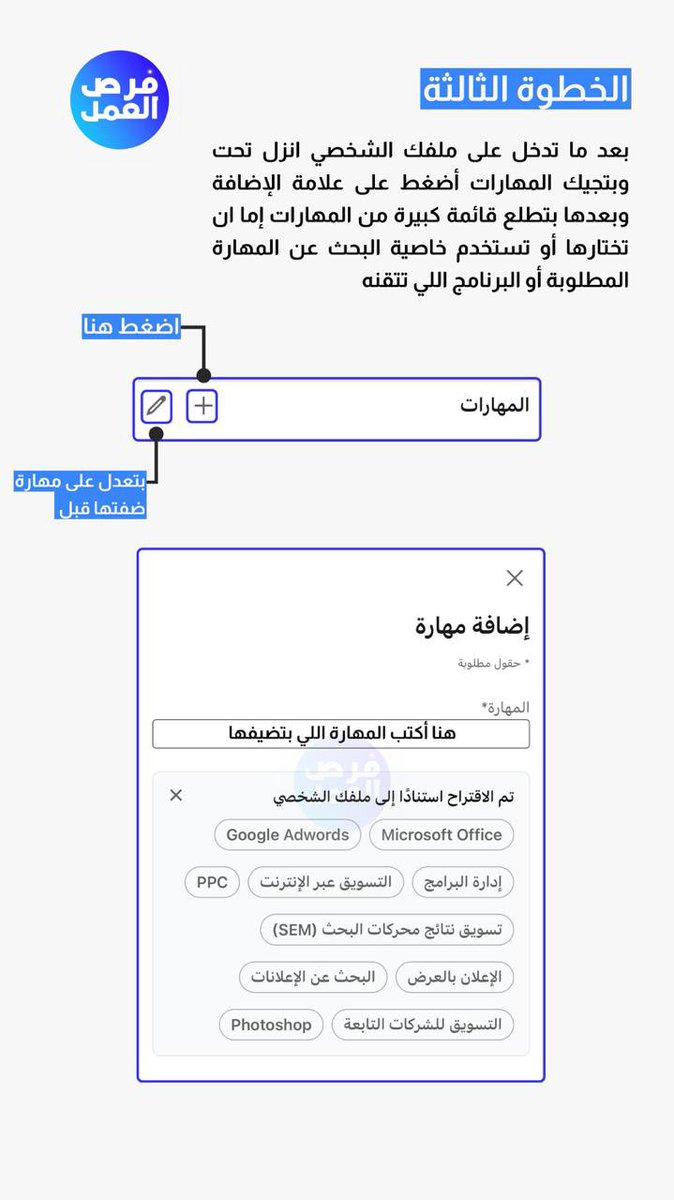 لما تضيف مهاراتك، تزيد فرصك تبان في نتائج البحث وتلفت نظر الشركات والموظفين.