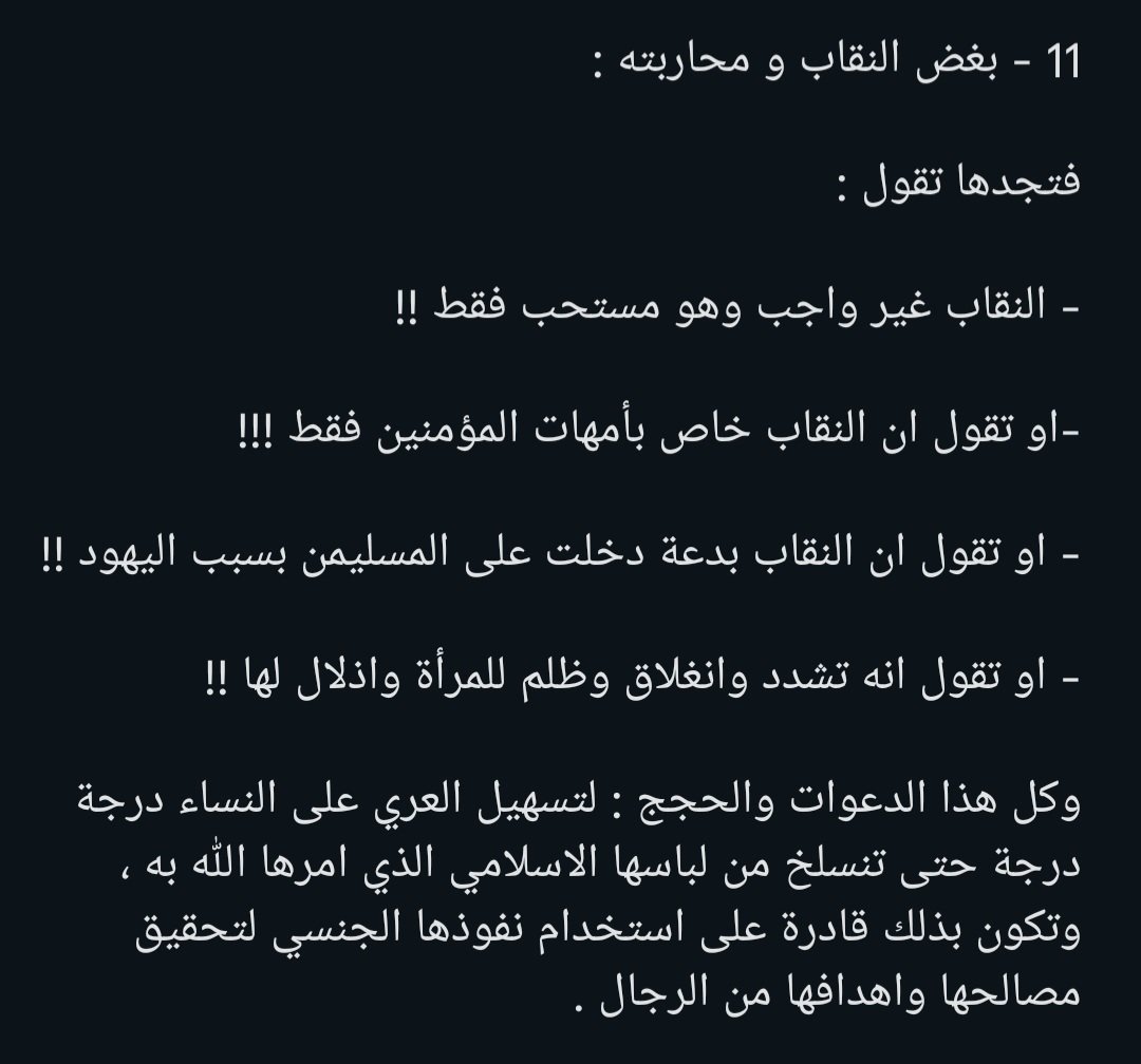 واقول ان خطر المتدثرة على المجتمعات الاسلامية والاسلام اعظم من خطر النسوية الراديكالية التي تصرح بشكل واضح عن اهدافها