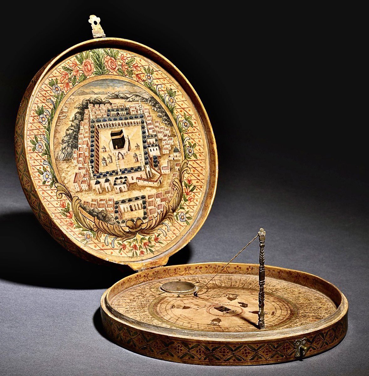 The qiblanuma literally means 'showing the direction to the Ka'ba'. The inside lid shows, shows the minarets of the Masjid al-Haram in Mecca, with the Ka'ba in the courtyard