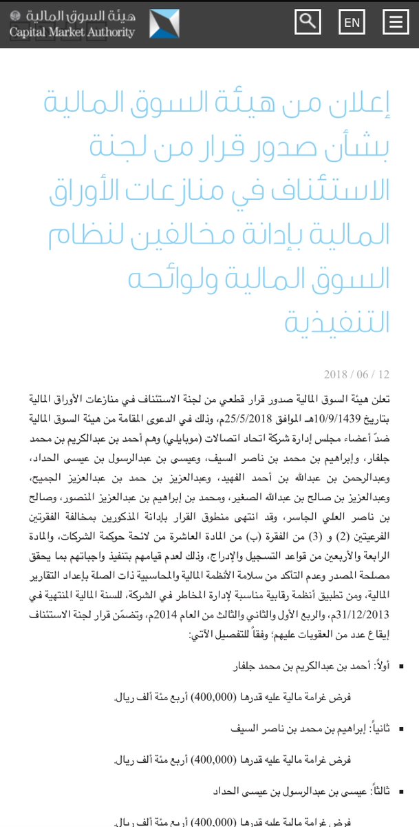 خالد الكاف الرئيس التنفيذي للشركة (تم إعفاءه في فبراير 2015) وعدد من التنفيذيين تمت ملاحقتهم واصدر فيهم الحكم العام: