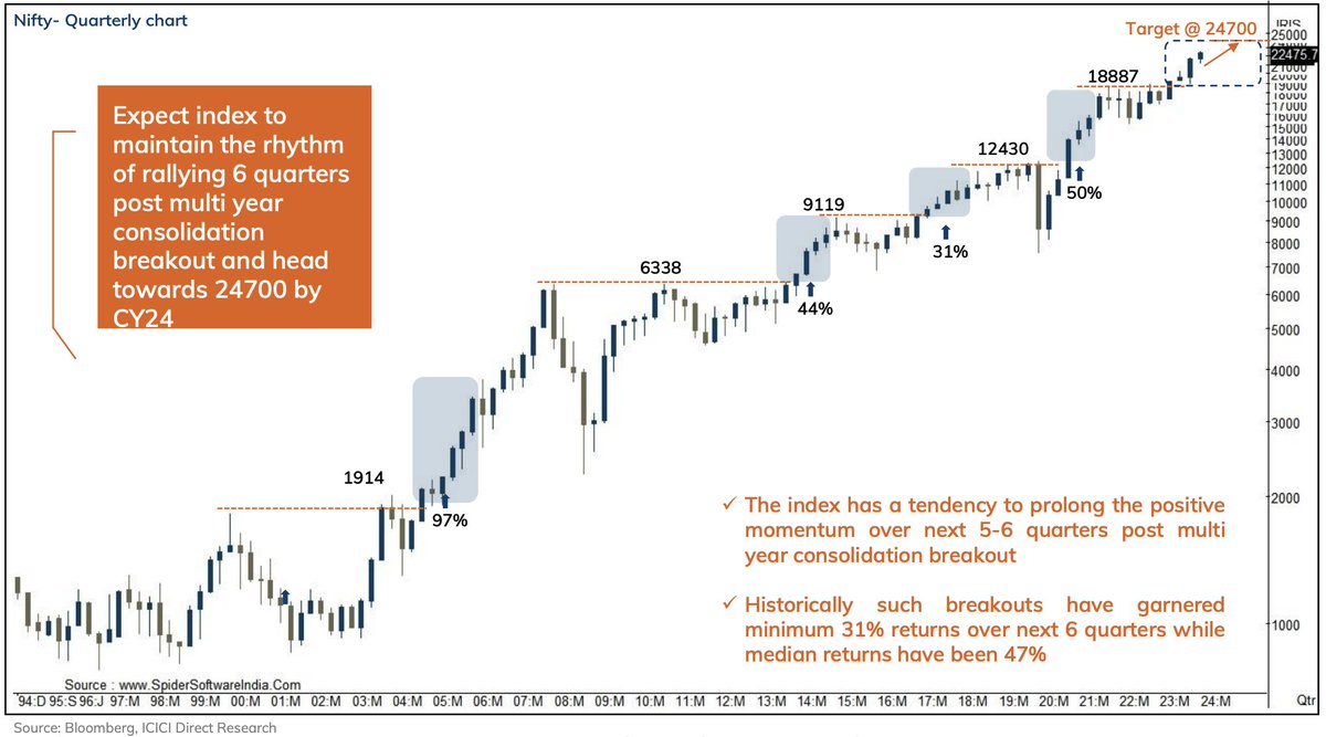 🔸In this edition of our Technical Strategy, we reiterate our constructive stance and expect Nifty to head for target of 23400 by Election outcome while key support is placed at 21700 which we expect to hold.