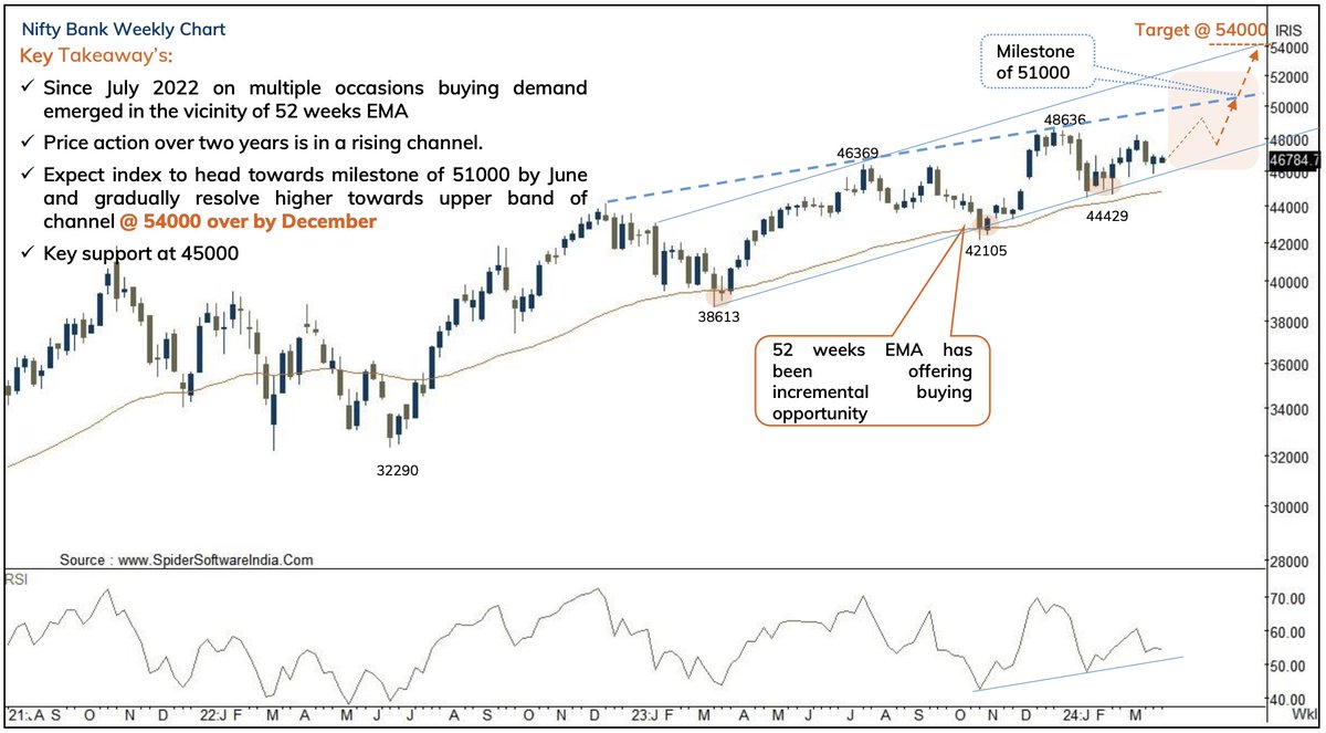 🔸Expect index to head towards milestone of 51000 by June and gradually resolve higher towards upper band of channel @ 54000 over by December.
