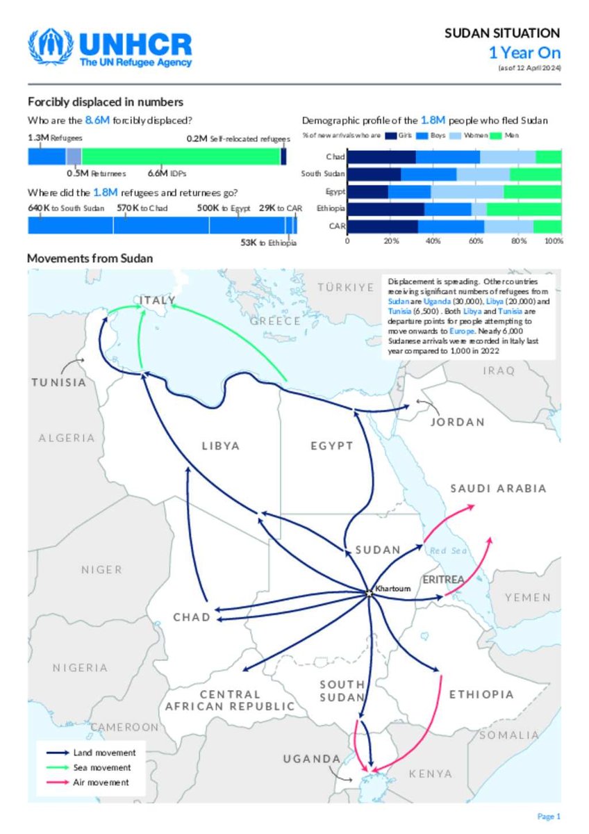 ◼️ وسجلت آخر إحصائية لمكتب الأمم المتحدة لتنسيق الشؤون الإنسانية (OCHA) عدد اللاجئين منذ 15 أبريل خارج السودان 1.8 مليون شخص في دول الجوار ما بين تشاد٬ مصر٬ جنوب السودان٬ اثيوبيا٬ افريقيا الوسطى٬ اوغندا والسعودية وبعضهم هاجر الى اوروبا بالبحر.