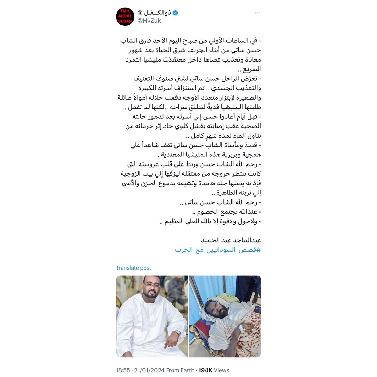◾️ شهادة أحد المعتقلين تعسفياً من قبل مليشيا الدعم السريع الذي تعرض للتعذيب والتجويع والتنكيل.