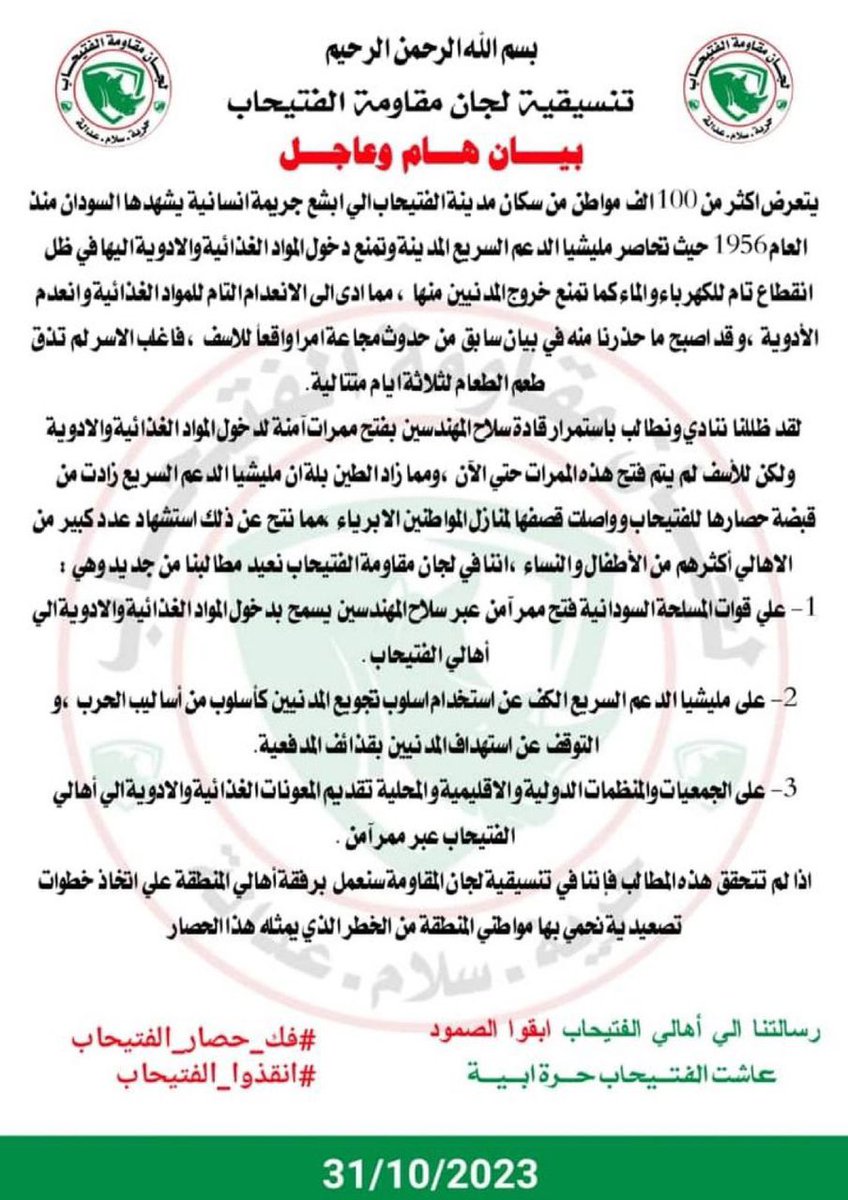 ايضاً اصدرت مليشيا الدعم السريع بيانًا وقالت فيه إنها لن تسمح بمرور المساعدات من بورتسودان بالوصول إلى الفاشر.(٣)