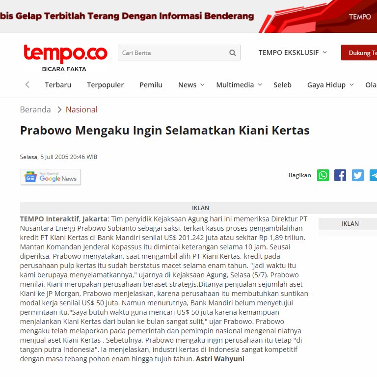 Ia menceritakan bagaimana Yayasan Kobame (Korps Baret Merah) yang didirikan pada 1993 harus menyerahkan kapal feri bernama Tribuana I ke Nusantara Energy, yang "berada di bawah kepemilikan Prabowo."