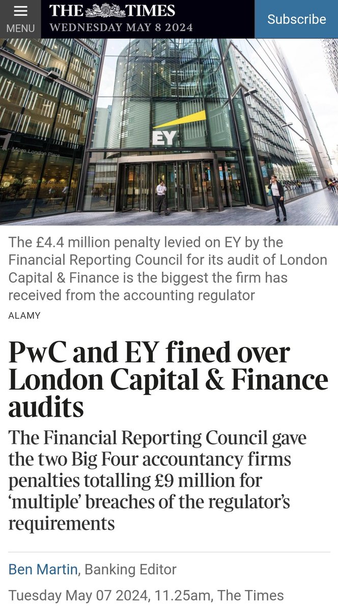 بريطانيا توبخ و تغرم شركتي #المحاسبة "الأربعة الكبار" برايس ووترهاوس كوبرز #PwC و إي واي #EY مجتمعة بمبلغ 9.3 مليون جنيه إسترليني.
