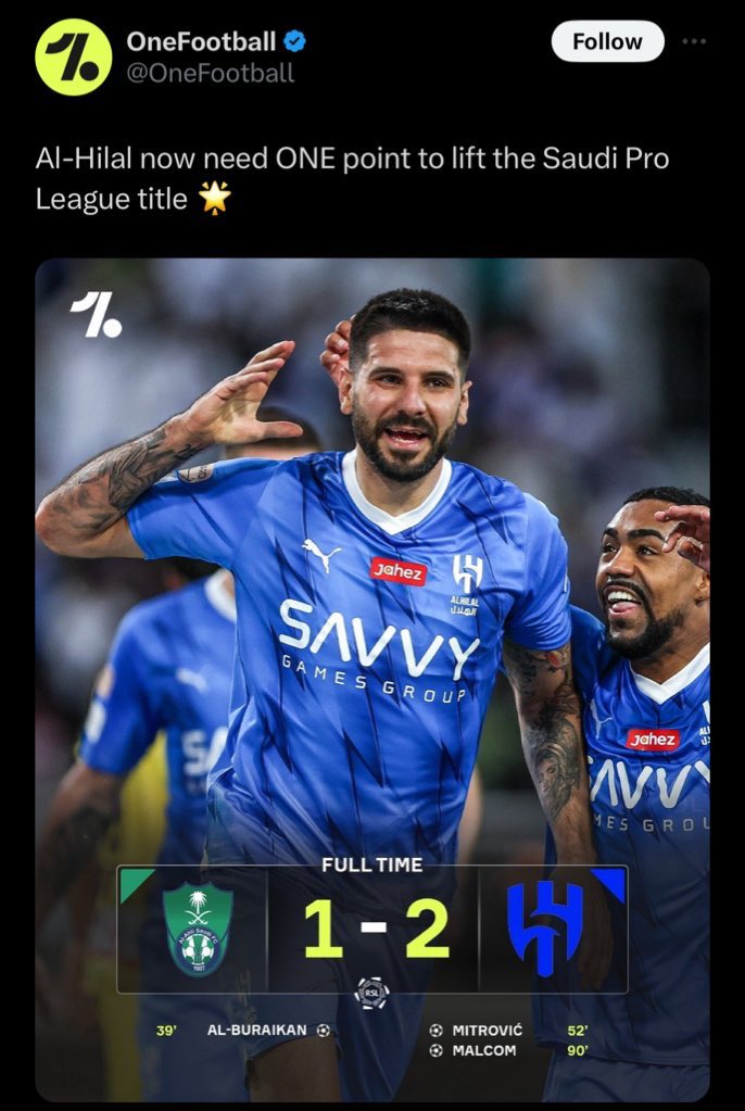 موقع"clarosports المكسيكي: "بهدف رائع من #مالكوم على طريقة مارادونا، #الهلال يخطو خطوة أخرى نحو الفوز بلقب الدوري السعودي.. في مباراة بجرعة كبيرة من الدراما يحافظ الهلال على إيقاعه الخالي من الهزائم.. كان مالكوم هو البطل العظيم في اللقاء، حيث قدم أسلوب لعب "مارادوني" للغاية في الدقيقة 89، عندما استولى على الكرة خلف خط الوسط وبقوة ومهارة ترك المنافسين يركضون وراءه قبل أن ينفرد بحارس المرمى ويُطلق تسديدة قوية