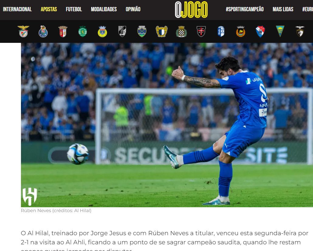 صحيفة "ojogo" البرتغالية: "فاز #الهلال، الذي يدربه خورخي جيسوس ومع روبن نيفيز في التشكيلة الأساسية، بنتيجة 2-1 يوم الاثنين في زيارته للأهلي، مما تركهم على بعد نقطة واحدة من أن يصبحوا أبطال الدوري السعودي