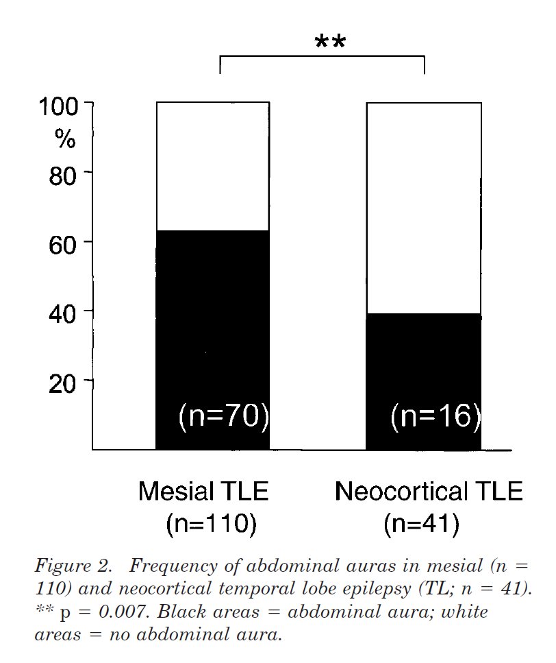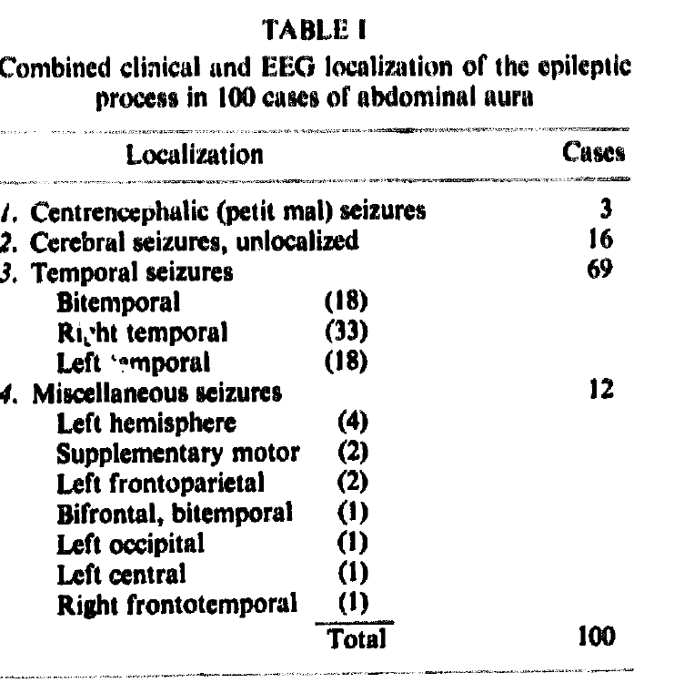 16/ Other less frequently associated epileptogenic zones reported with abdominal auras include mesial frontal, orbitofrontal and insula, varying between 19 to 30% of cases.