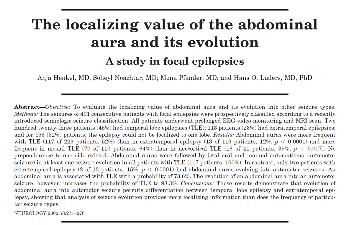 2/ In majority of cases, this feeling is localized to the epigastric area, hence the other term 'epigastric aura'. #AurasInEpilepsy #SeizureSemiology