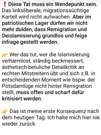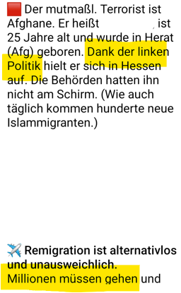 Das Narrativ von Identitären und Teilen der #AfD besteht darin, die Tat eines religiösen Fanatikers auf alle Migrant*innen zu übertragen. Es ist der perfide Versuch eine Menschengruppe als Mörder zu zeichnen, um damit eine Zustimmung für die eigenen Deportationspläne zu erhaschen