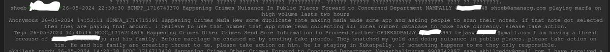 One Shoeb complained of noise pollution on May 26 in #Nampally due to marfa at 22:39 PM. His full name, mobile #, email id leaked. Another woman complained of threat to life from a man and his family after refusal to marry. Her name, email id, complaint leaked.
