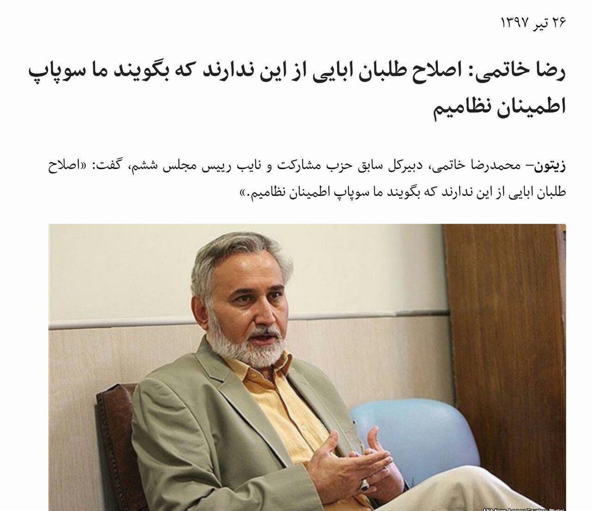 پیش از شروع خوبه توجه شما را به سخنان برادر محمد خاتمی و قوچانی یکی از فعالین اصلاح طلب جلب کنم که علنا با افتخار می گویند ما اصلاح طلبان سوپاپ رژیم هستیم