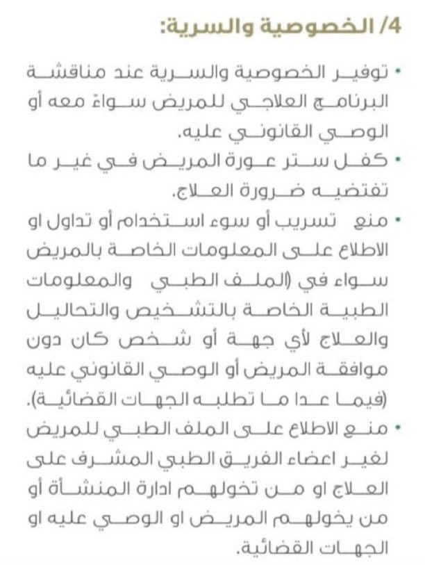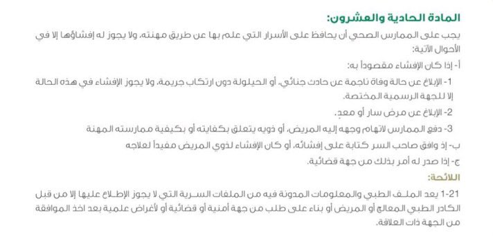 الطبيب جزء من مهامه ان يكون مدافعًا عن المريض بخصوصياته ؛ معرف الطبيب بهذه الأنظمة مهمة لتبليغ المريض ان خصوصيته محفوظة وله الحق بعدم اعطاء تقرير طبي عن حالته والاكتفاء باشعار إجازة مرضية رسمية يتم إصدارها عبر منصة ( صحتي ) ..