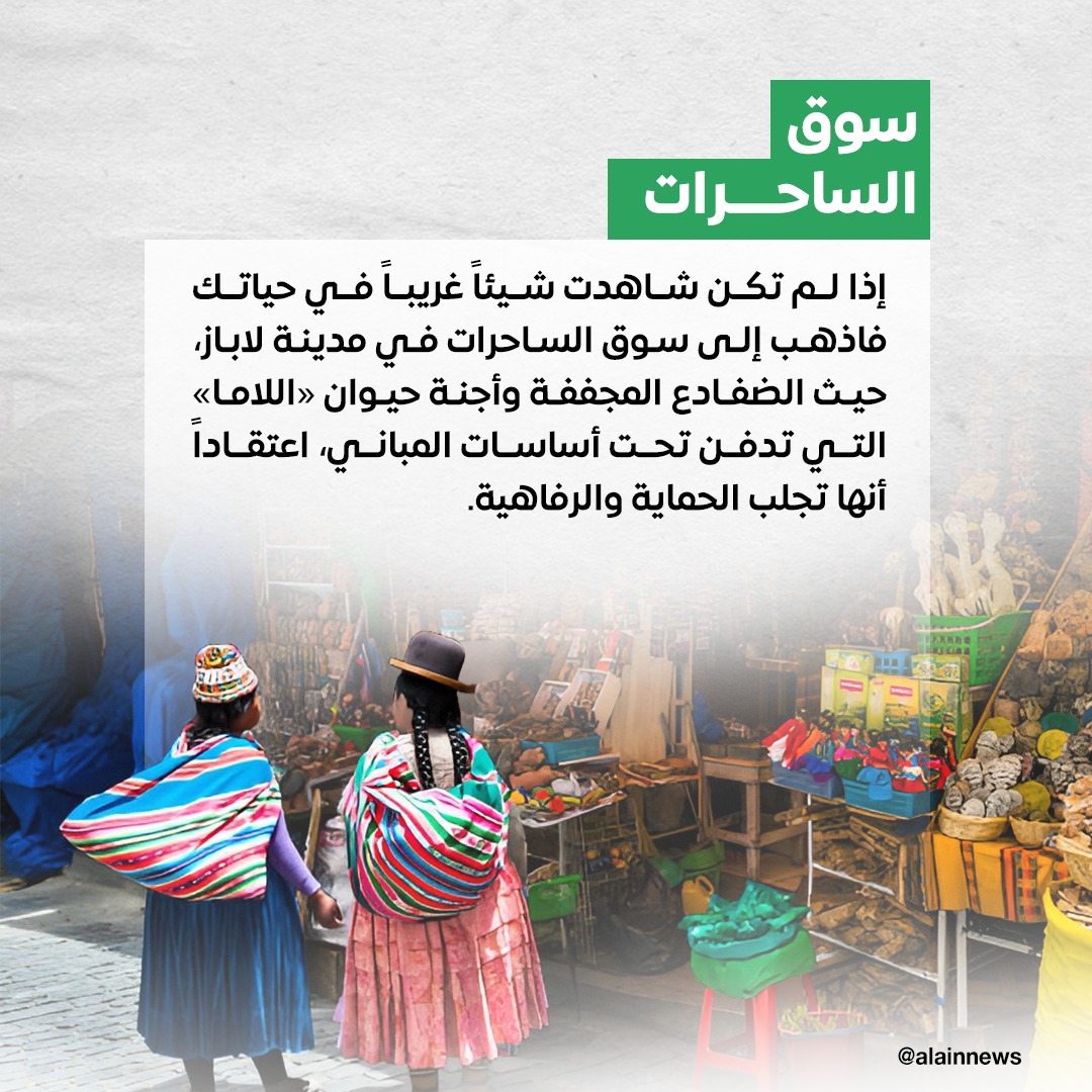 إذا لم تكن شاهدت شيئاً غريباً في حياتك فاذهب إلى سوق الساحرات في مدينة لاباز، حيث الضفادع المجففة وأجنة حيوان «اللاما» التي تدفن تحت أساسات المباني، اعتقاداً أنها تجلب الحماية والرفاهية.