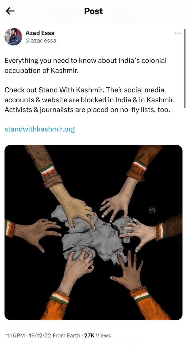 In 2019, Hafsa Kanjwal set up an organisation ‘Stand WithKashmir’ along with her cousin Sameera Fazili. Sehla Ashai — the founder on documents of Stand With Kashmir, is relative of Aziz Ashai aka Tony Ashai.